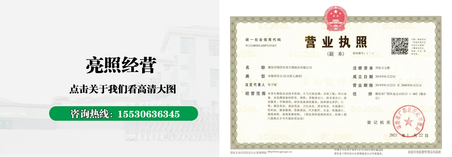 廊坊市綠營有害生物防治有限公司主要從事有害生物防治及環(huán)境消毒服務(wù),專注于白蟻預(yù)防工程、滅白蟻、滅老鼠、滅蟑螂、滅蚊蠅、滅跳蚤、滅臭蟲、滅紅火蟻、滅塵螨、消毒滅菌、家居清潔等有害生物的預(yù)防和治理服務(wù)。本公司面向,公共場所、商務(wù)樓、商場、超市、公園、工廠、酒店、餐廳、浴場、私人住宅等各類環(huán)境,公司一直堅(jiān)持以健康環(huán)保為前提,讓我們多一份健康”為宗旨,結(jié)合安全、、無反彈、對(duì)人畜安全無害,解決您的后顧之憂,與您共同打造一個(gè)無害、潔凈、舒適、健康的生活環(huán)境。...